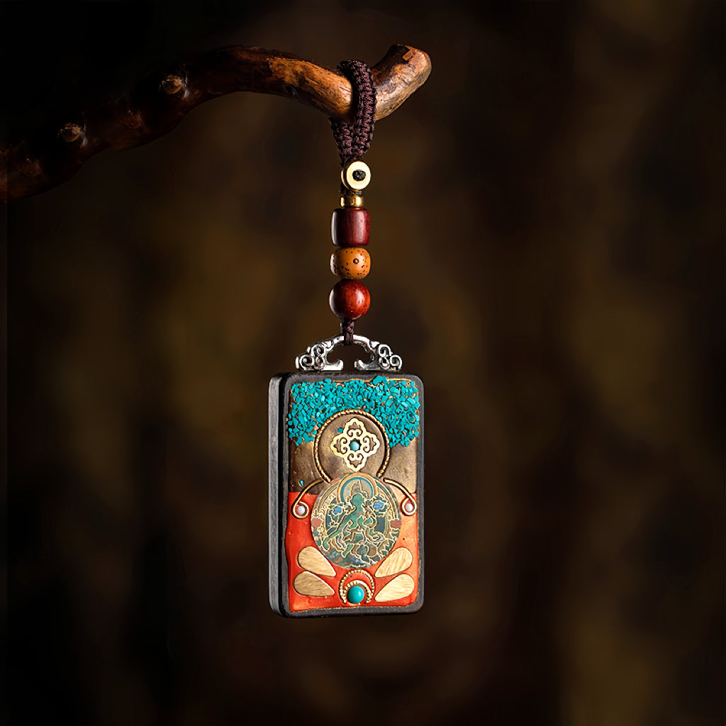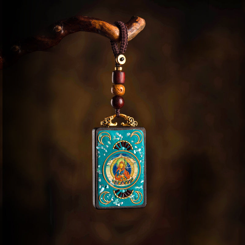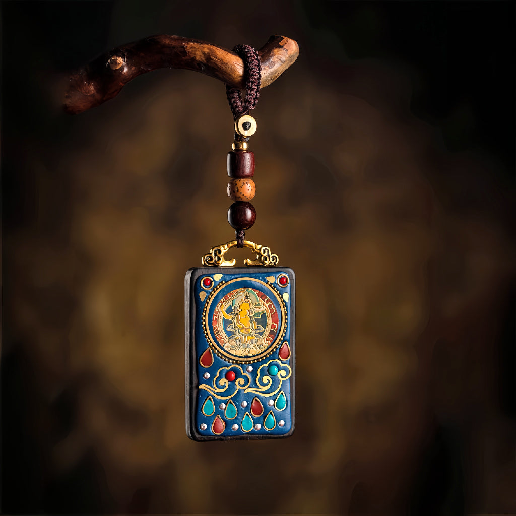 Each amulet is carved from a solid piece of Precious Ebony and then painstakingly hand-inlaid by artisans with vibrant crushed stones, brass, and silver to re-create powerful Thangka-style iconography. This is a potent, tangible connection to ancient wisdom and divine protection.