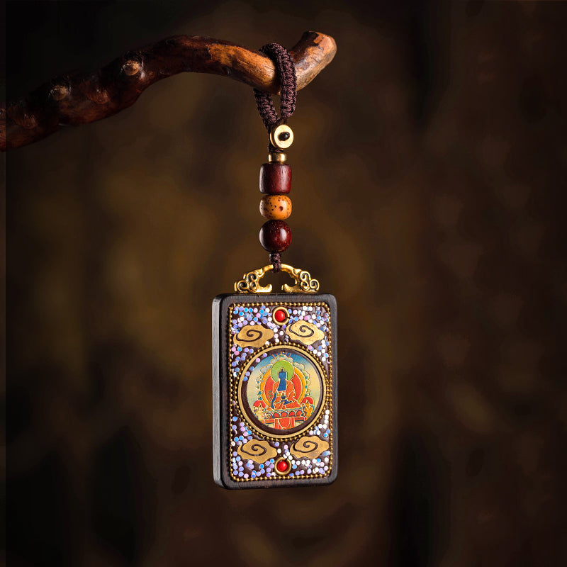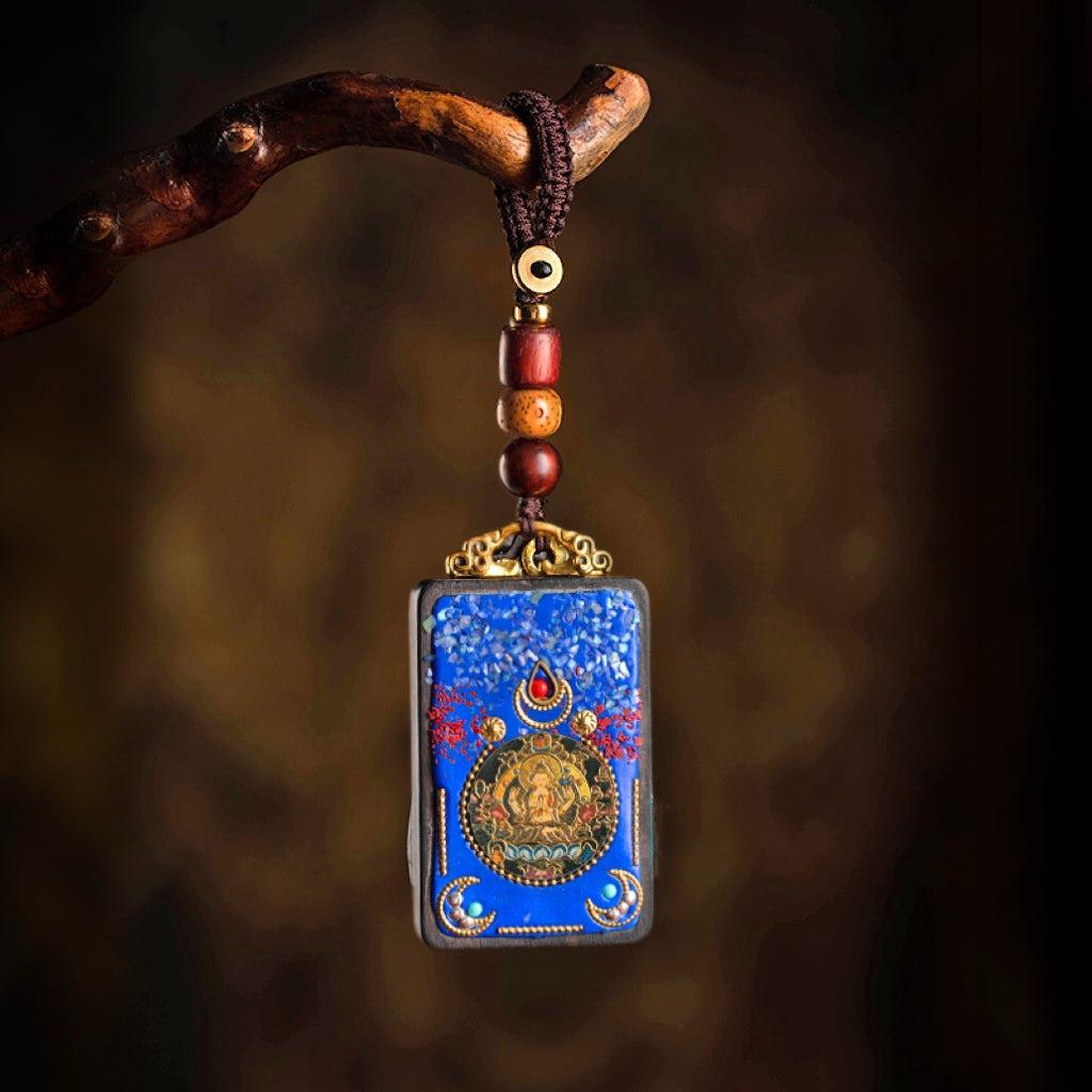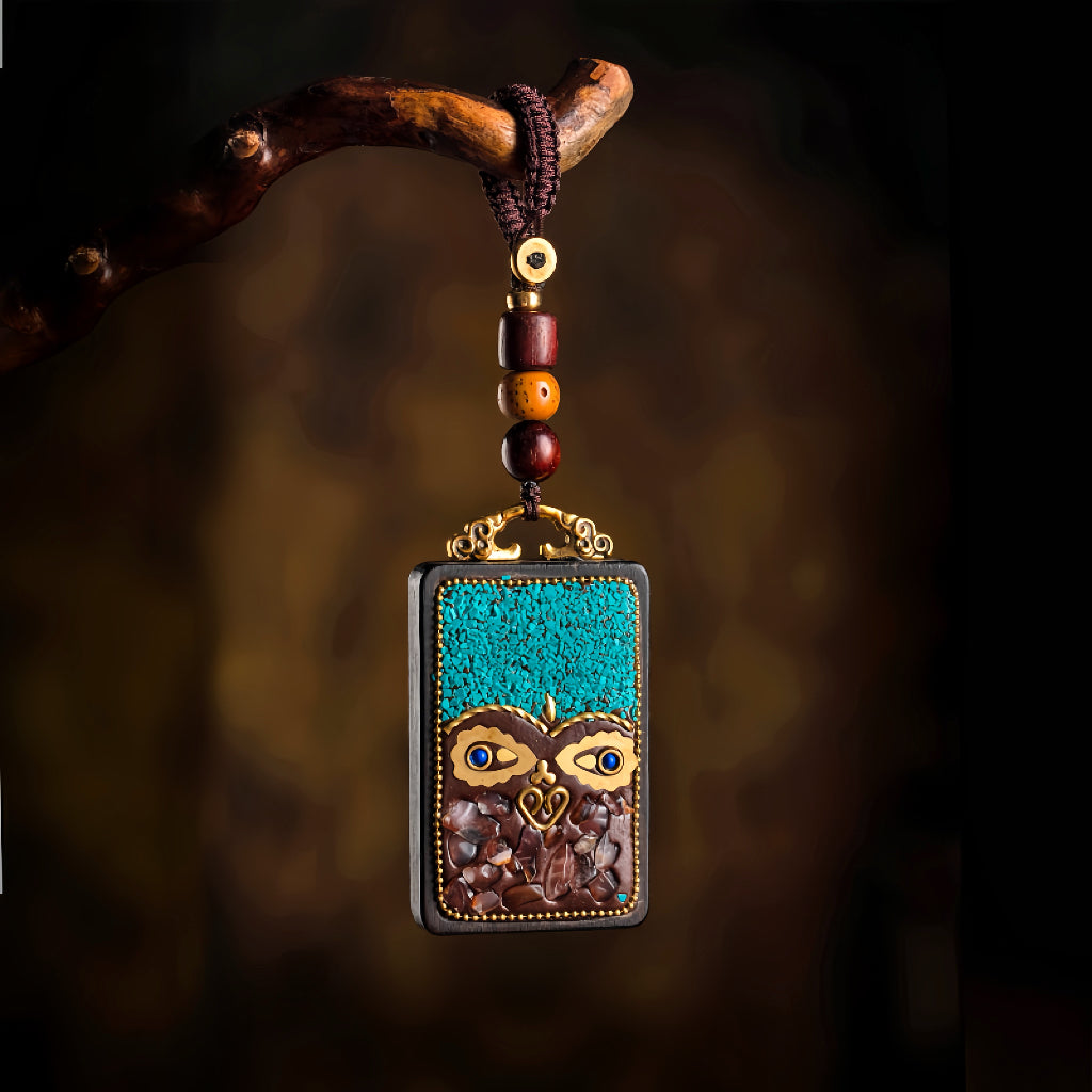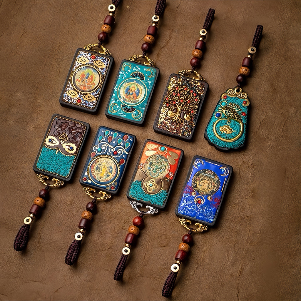 Each amulet is carved from a solid piece of Precious Ebony and then painstakingly hand-inlaid by artisans with vibrant crushed stones, brass, and silver to re-create powerful Thangka-style iconography. This is a potent, tangible connection to ancient wisdom and divine protection.