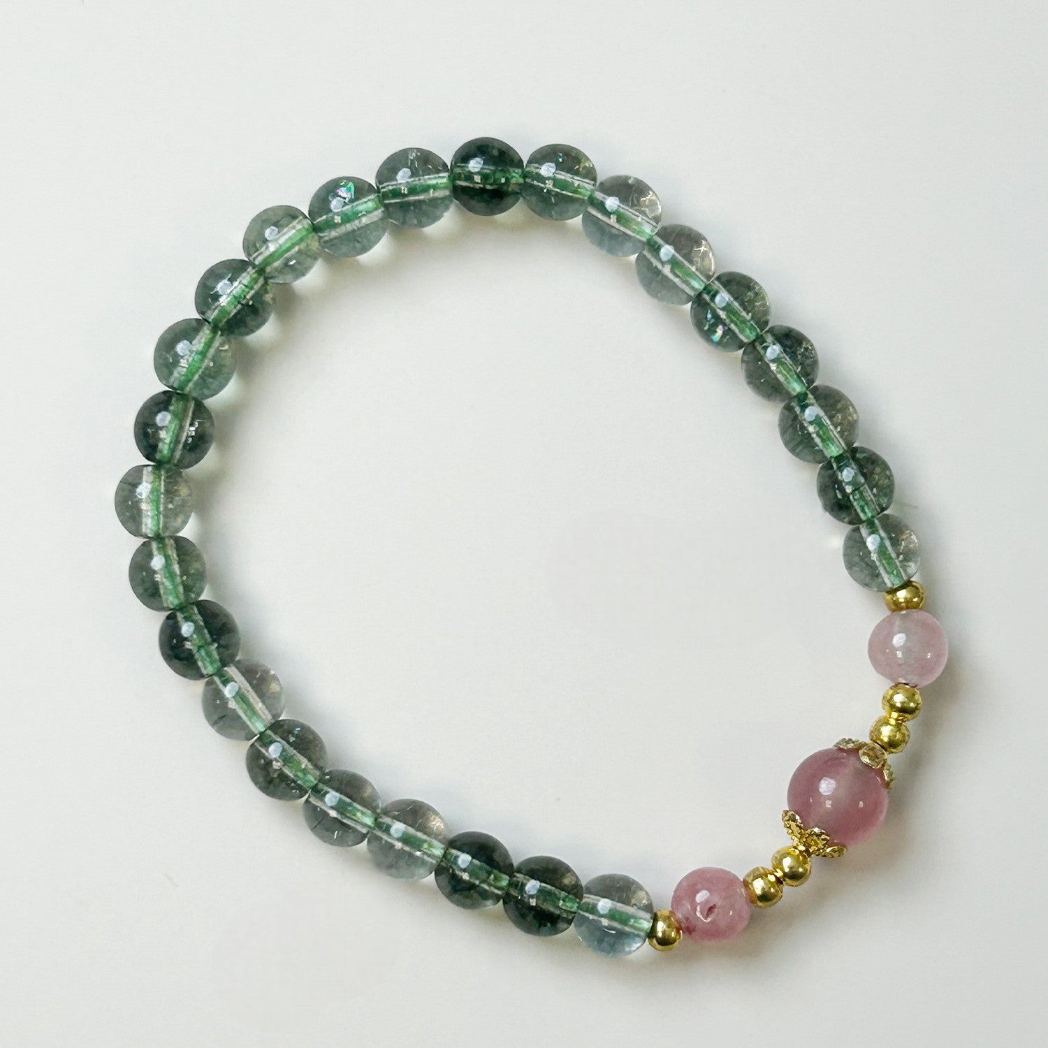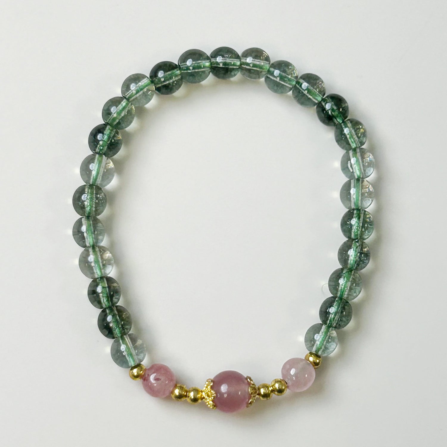 Strawberry quartz has long been cherished as a stone of love and emotional healing, while green phantom quartz symbolizes growth, renewal, and spiritual clarity. Together, they create a powerful charm to nurture the heart, mind, and spirit.