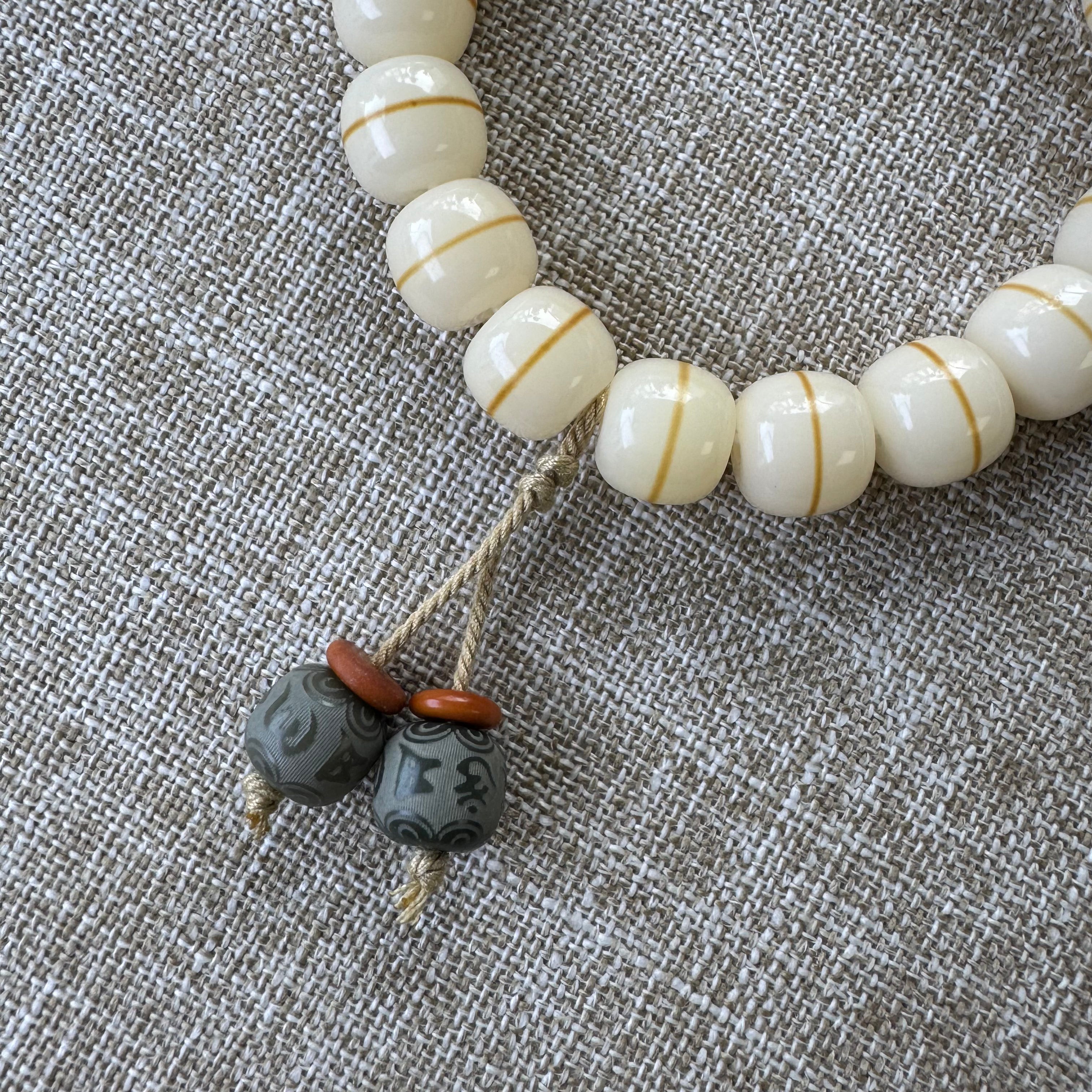 - Materials: White Bodhi Beads, Dzi-Inspired Bead, Mantra Tassel