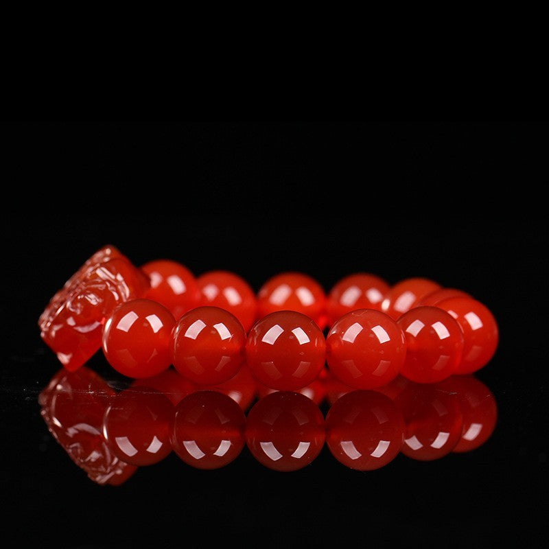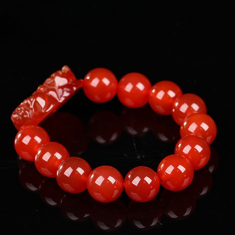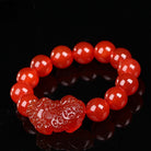 The Pixiu, a mythical creature in Chinese culture, is revered as a guardian of wealth and a protector against negativity. Paired with natural red agate beads—believed to enhance vitality, courage, and emotional balance—this bracelet serves as both a stylish accessory and a personal talisman of fortune and stability.