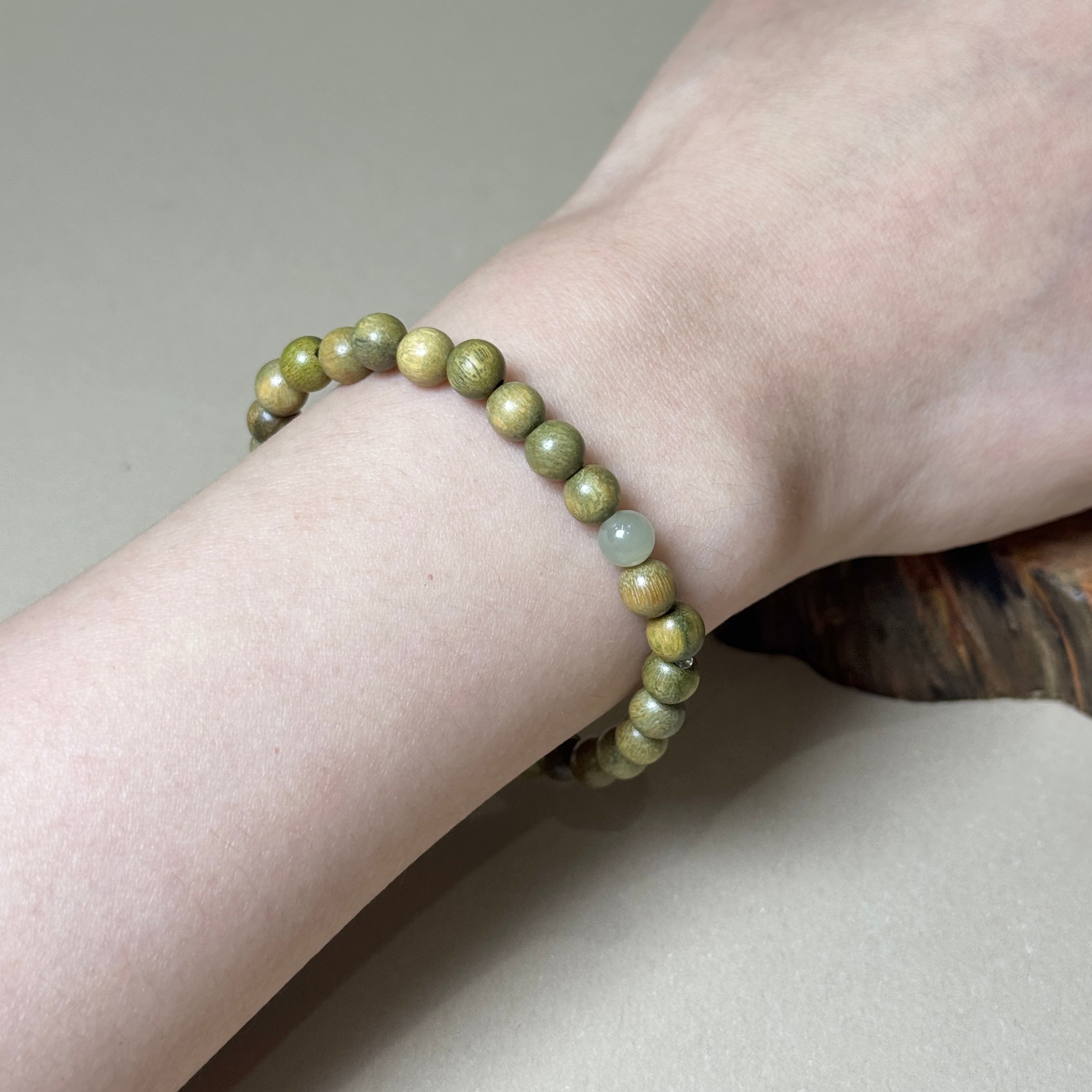 This bracelet is made of 6mm green sandalwood beads, known for their soothing scent and calming energy, paired with a jade bead that symbolizes harmony, protection, and prosperity. Together, they create a timeless accessory that not only enhances your style but also supports emotional balance and mindfulness.
