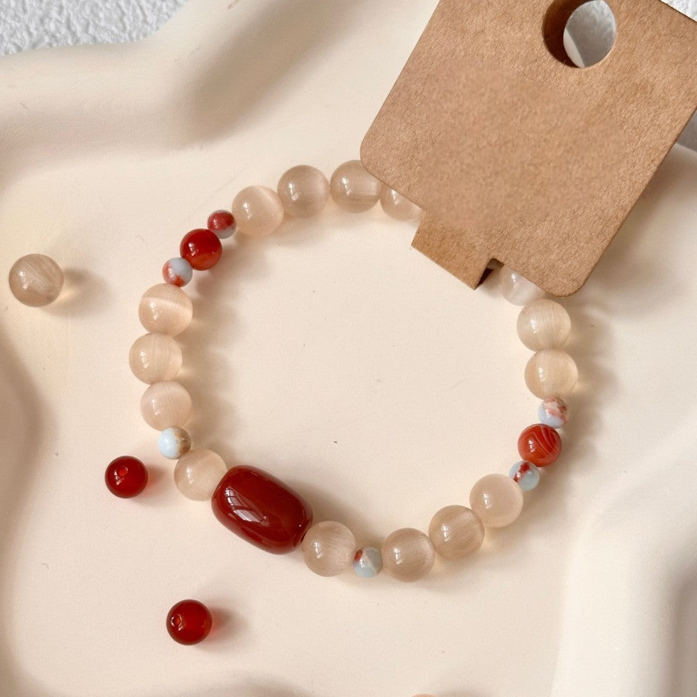 Introducing the Apricot Cat's Eye Red Agate Love Bracelet — a meaningful talisman of love, protection, and emotional harmony! Red Agate is revered for its ability to enhance courage, stability, and positive energy, while Cat's Eye brings insight, intuition, and clarity. Together, these stones create a stunning bracelet that serves as a symbol to attract love, confidence, and inner balance into your life.