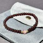 This delicate bracelet features a central strawberry quartz luck bead flanked by deep red garnet stones, known for their grounding and revitalizing energy. Carefully handcrafted, it’s designed to support emotional healing, boost motivation, and open your heart to aligned opportunities.