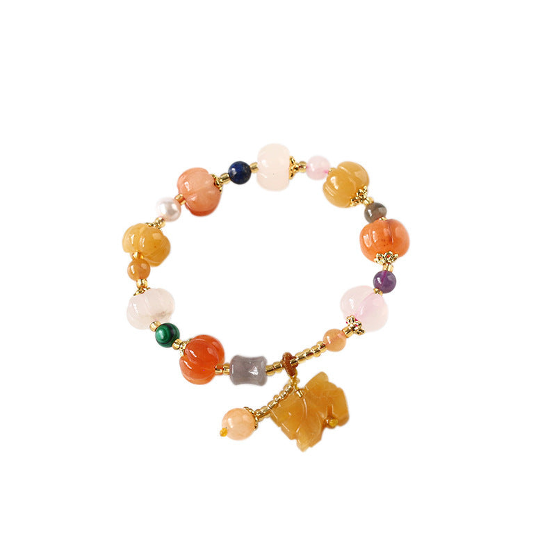 In Chinese culture, the Pixiu (貔貅) is a legendary creature revered as a guardian of wealth and a protector against misfortune. The pumpkin, a symbol of abundance and continuous growth, amplifies the flow of positive energy. Combined with gold silk jade, these elements form a bracelet that embodies prosperity, protection, and spiritual well-being.