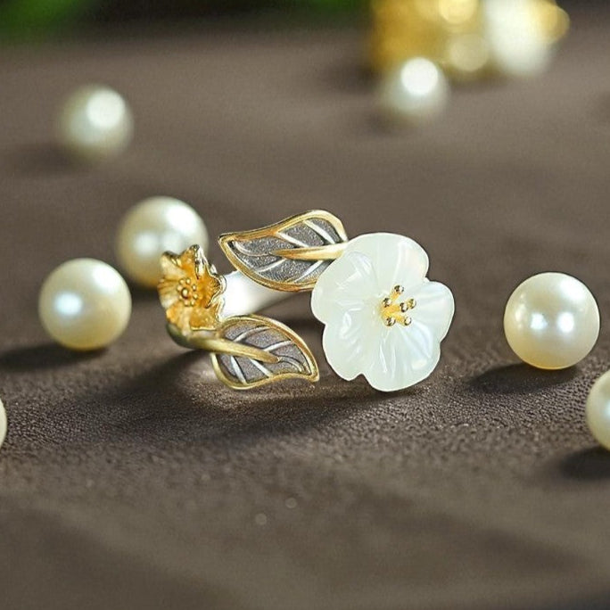 Floral Gold Accented White Jade Pendant Balance Necklace