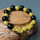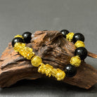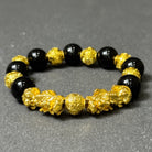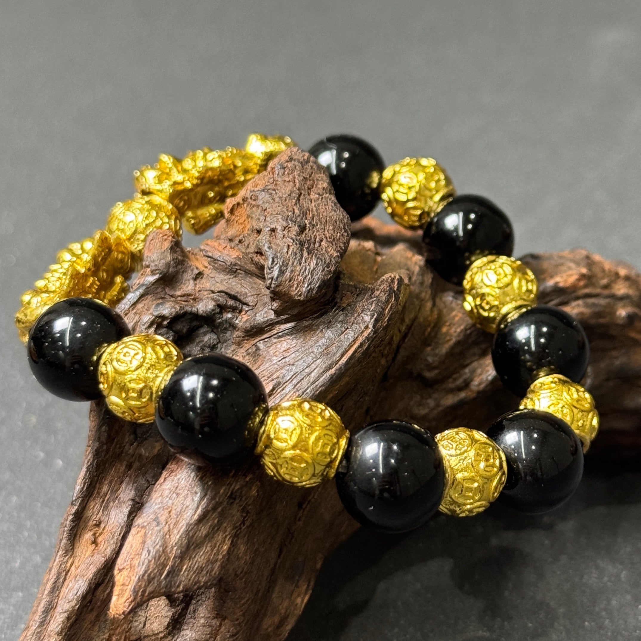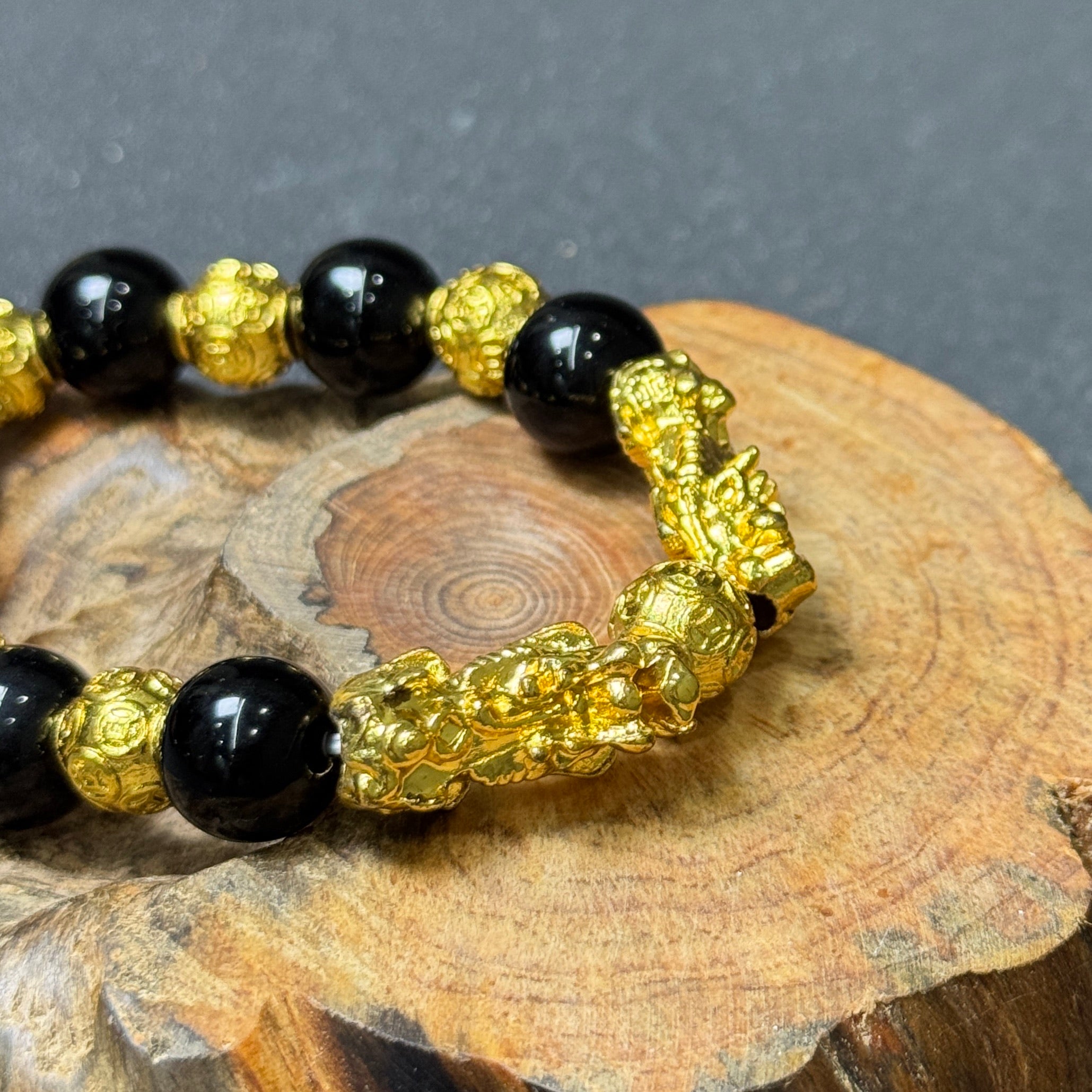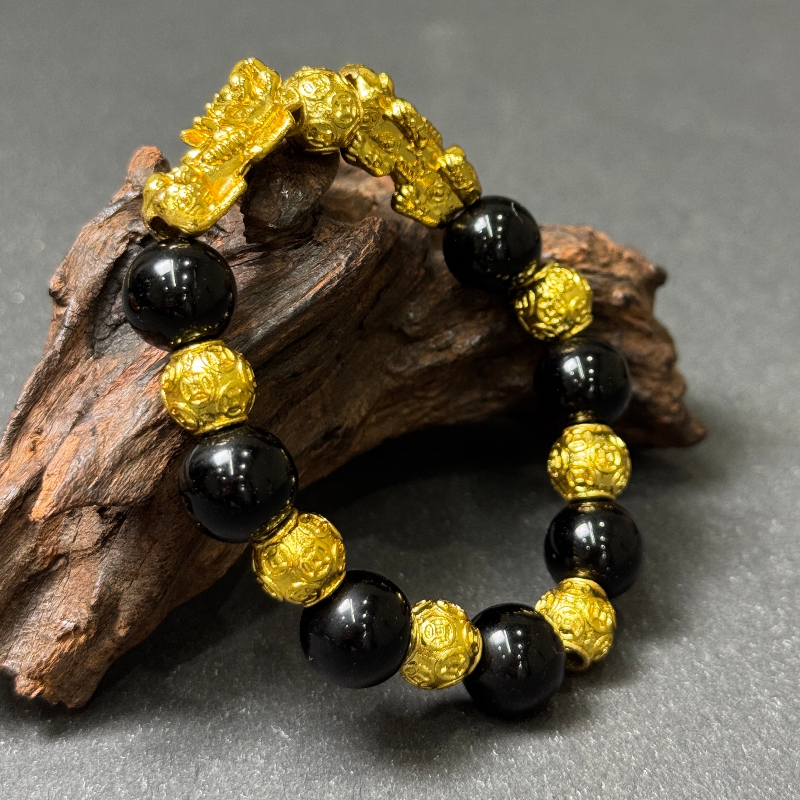 Featuring a pair of detailed Pixiu figures playing with a golden wealth bead, this bracelet integrates powerful motifs: