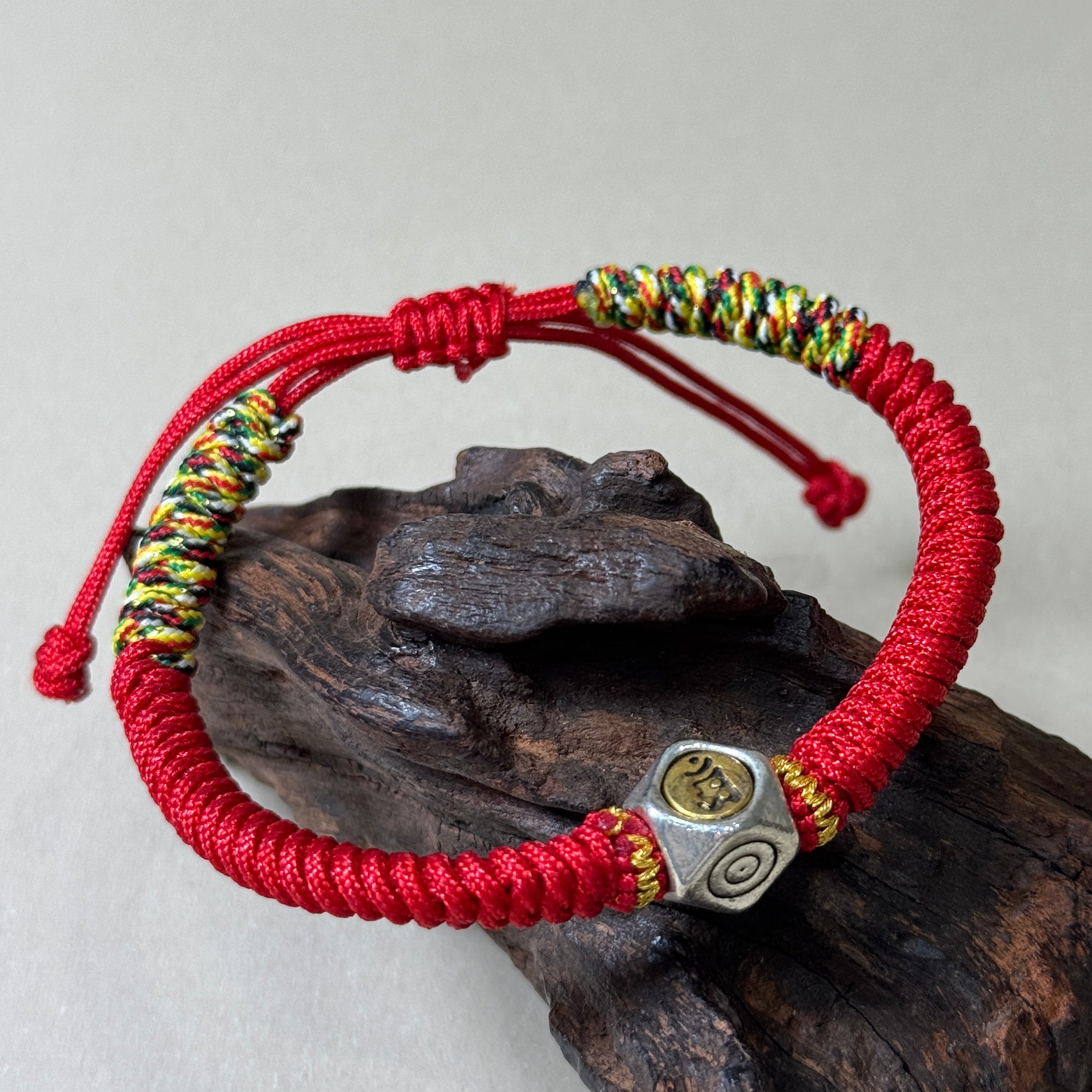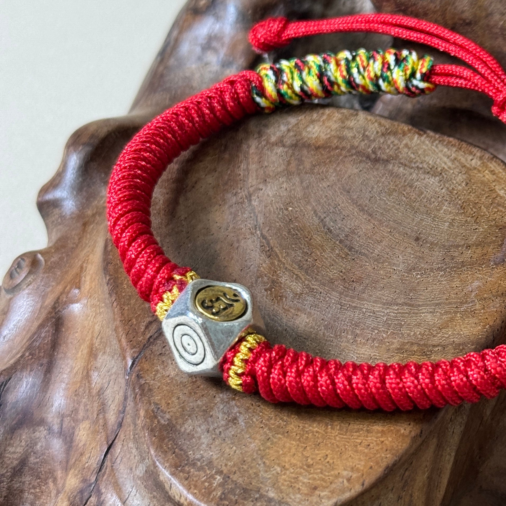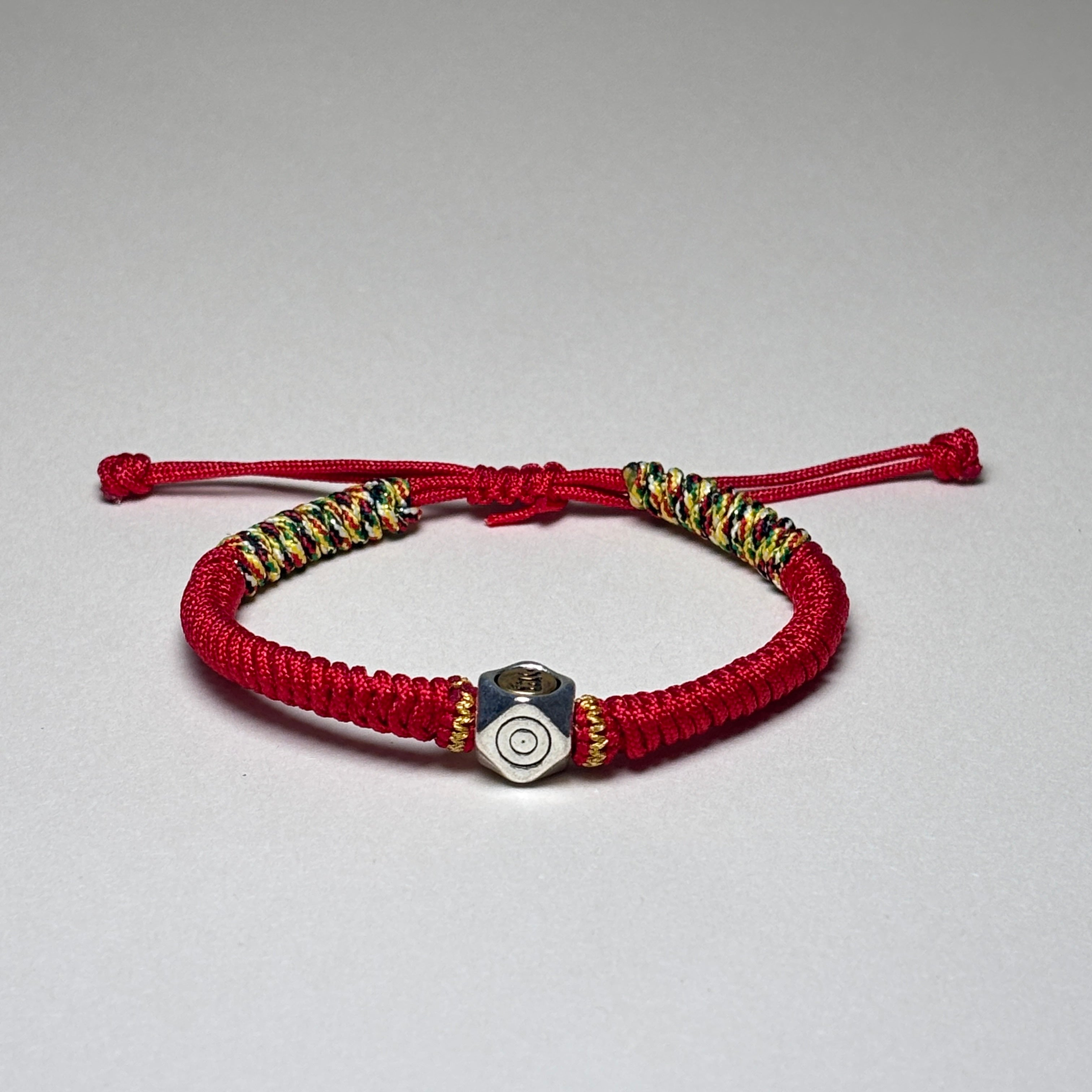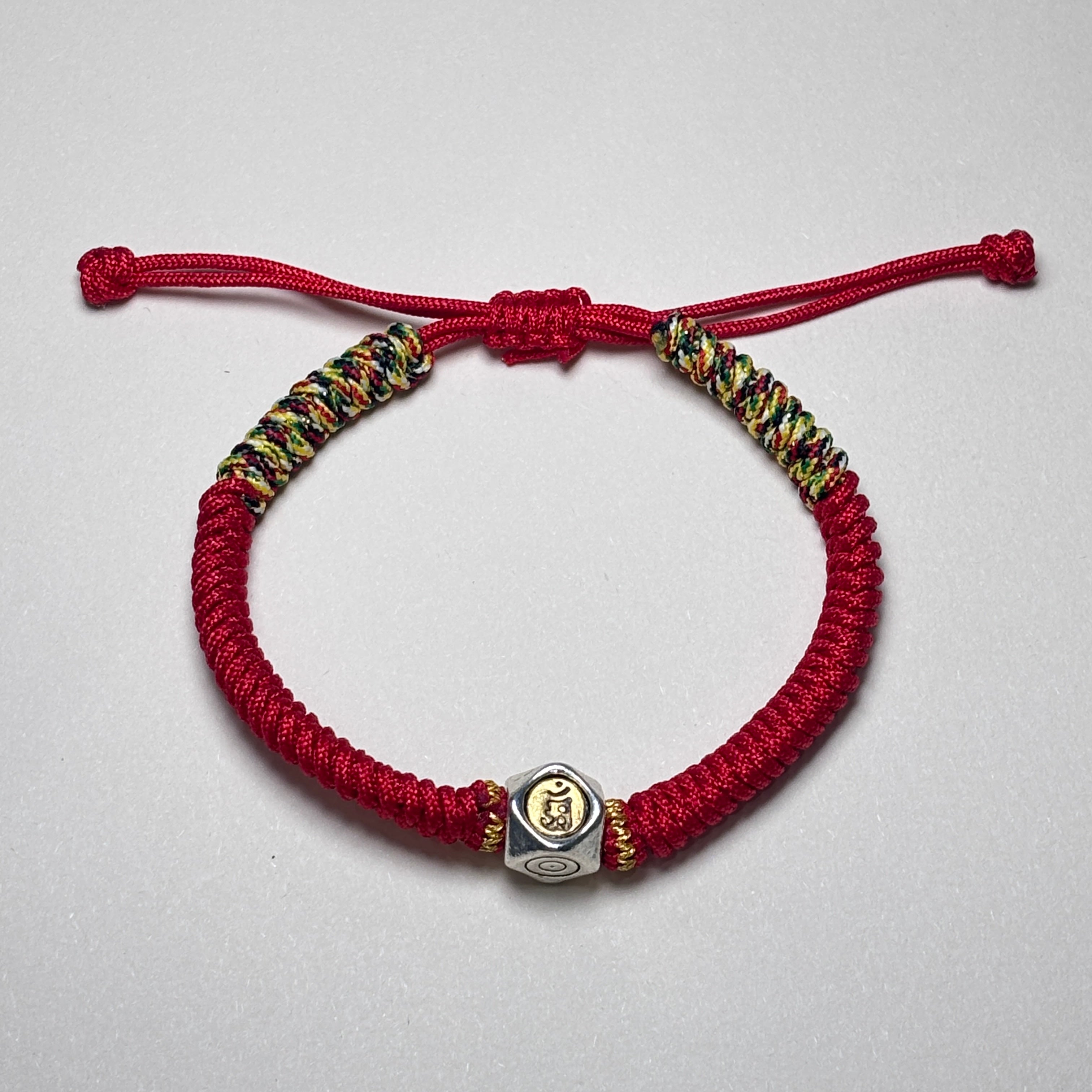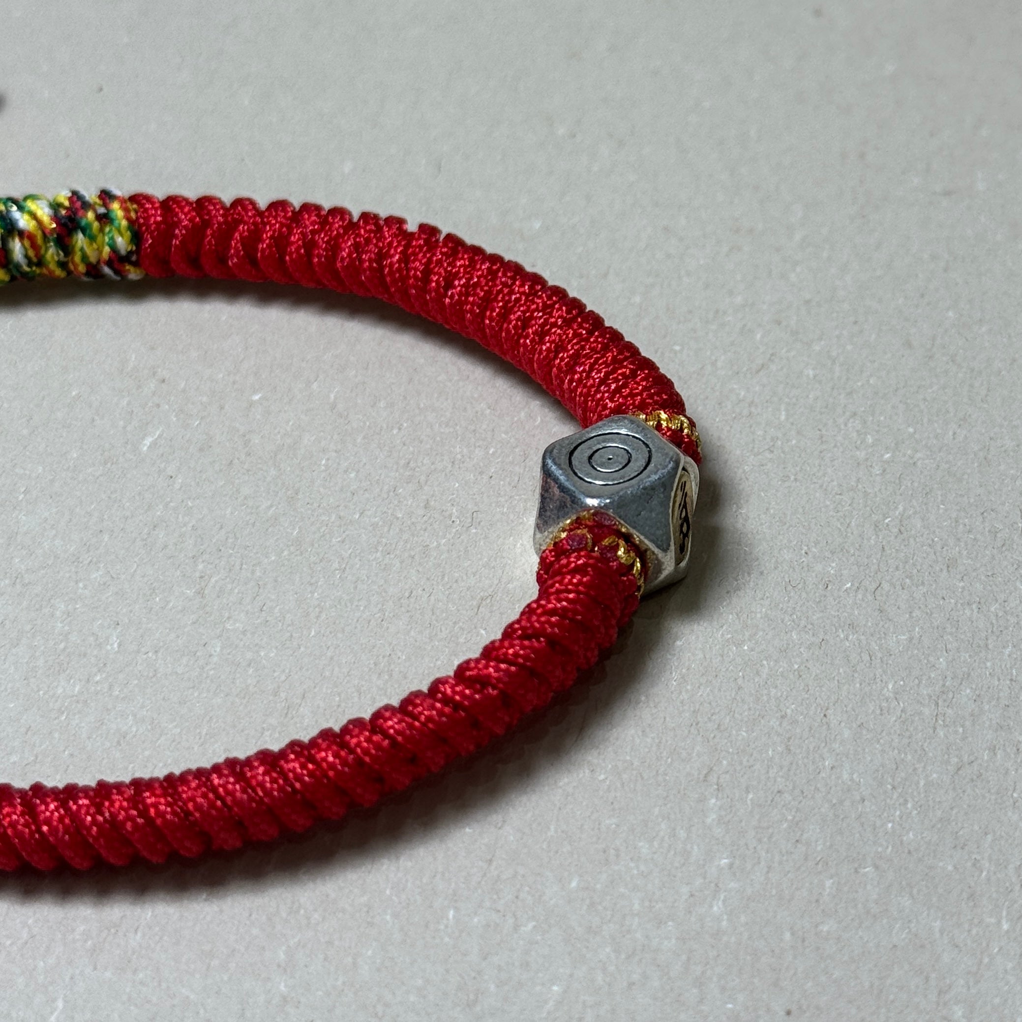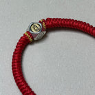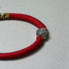 The bracelet is handwoven from vibrant red string, a powerful symbol in Buddhist tradition for warding off negativity and misfortune. At its center rests a finely crafted silver bead.