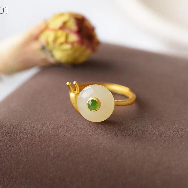 Each element holds rich symbolism: Hetian jade safeguards harmony and prosperity, while the snail inspires you to advance at your own pace, steadily and surely. Crafted in an elegant open-ring design, it offers an adjustable fit for comfort and versatility, making it both a personal talisman and a thoughtful gift.