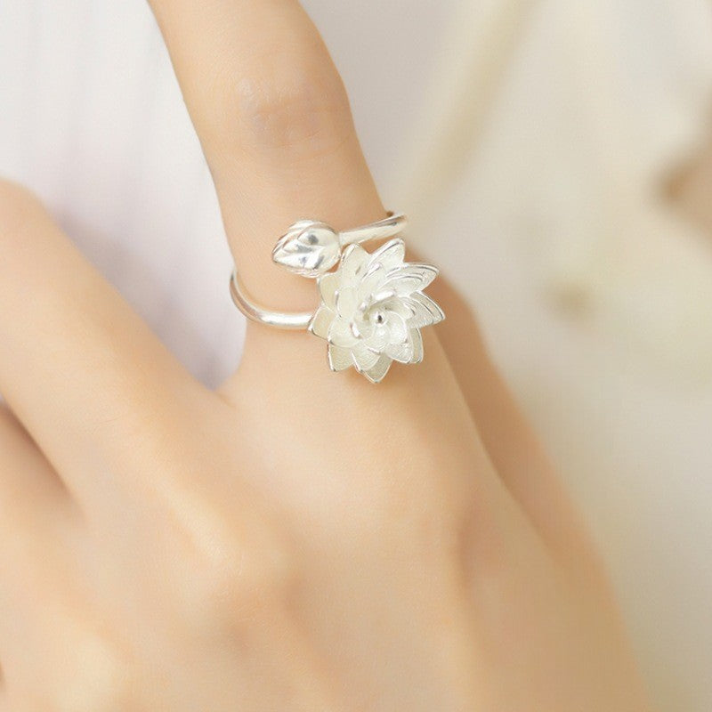 The white lotus represents purity of mind and spirit, emerging beautifully even from muddy waters—a reminder of strength, renewal, and spiritual clarity. The open design allows for an adjustable fit, ensuring comfort while maintaining a refined and graceful appearance.