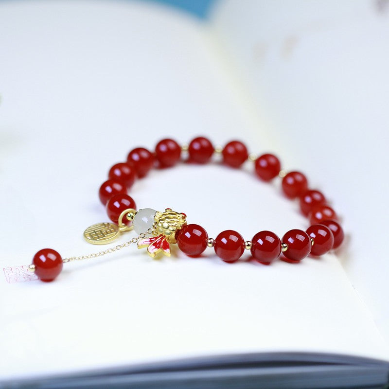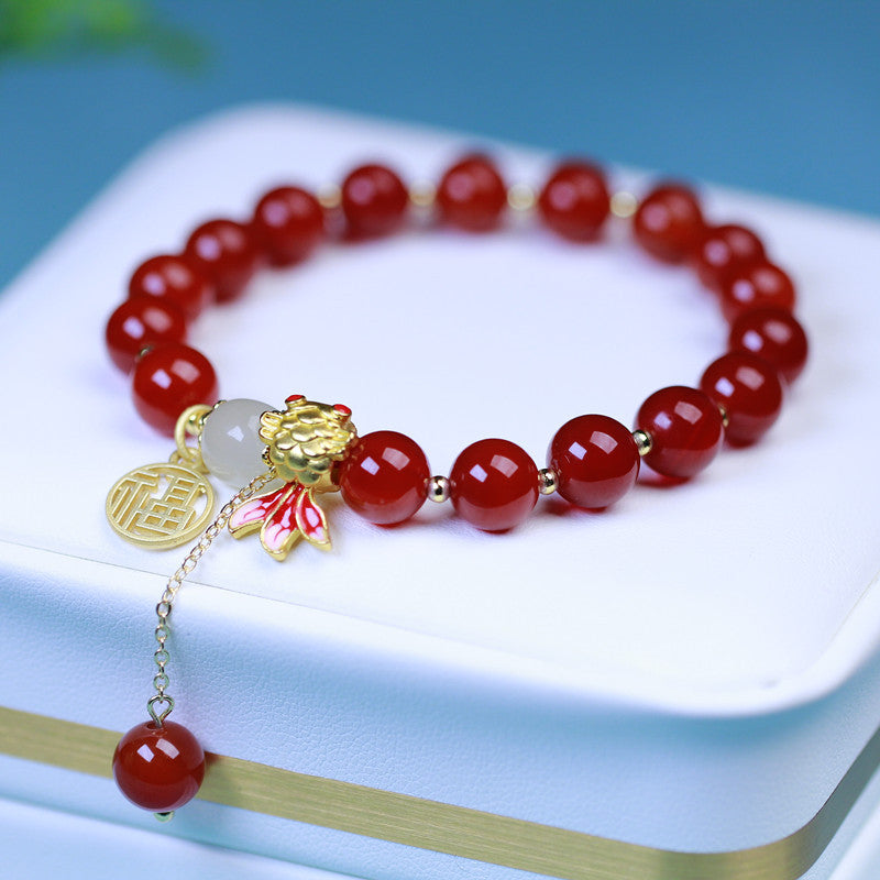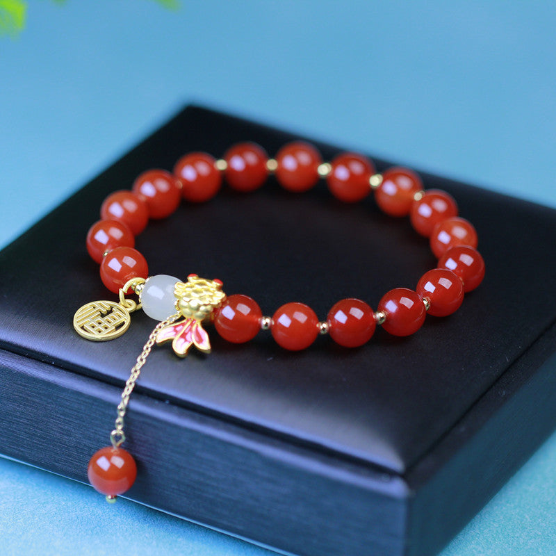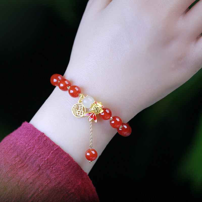 Wear the Red Agate Hetian Jade Goldfish Pendant Wealth Bracelet to welcome abundance, positivity, and joyful energy into your life.