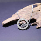 The Six-Syllable Mantra Double Ring Necklace is crafted with intricate Tibetan-inspired design, featuring two interlocking rings engraved with the sacred mantra “Om Mani Padme Hum.” The outer ring frames the inner rotating band, symbolizing infinite cycles of wisdom and protection. Worn close to the heart, it serves as both a unique statement piece and a spiritual talisman.
