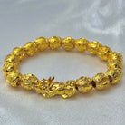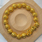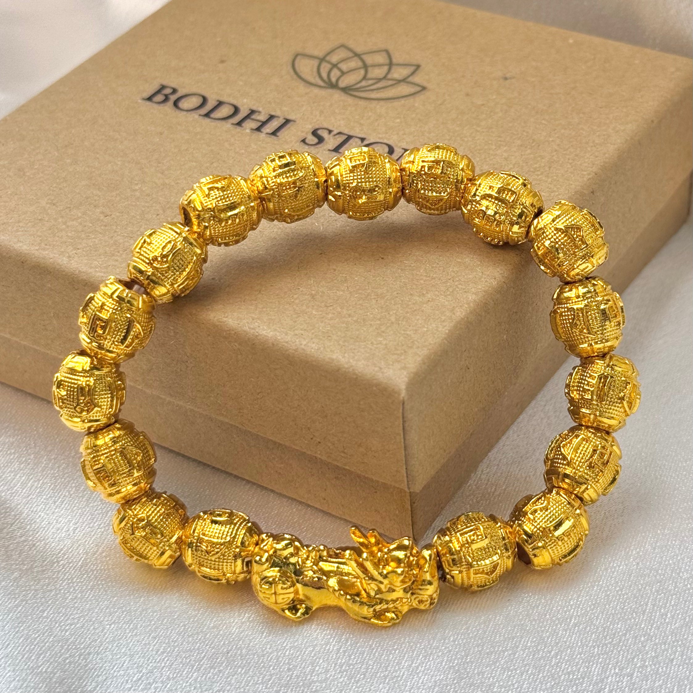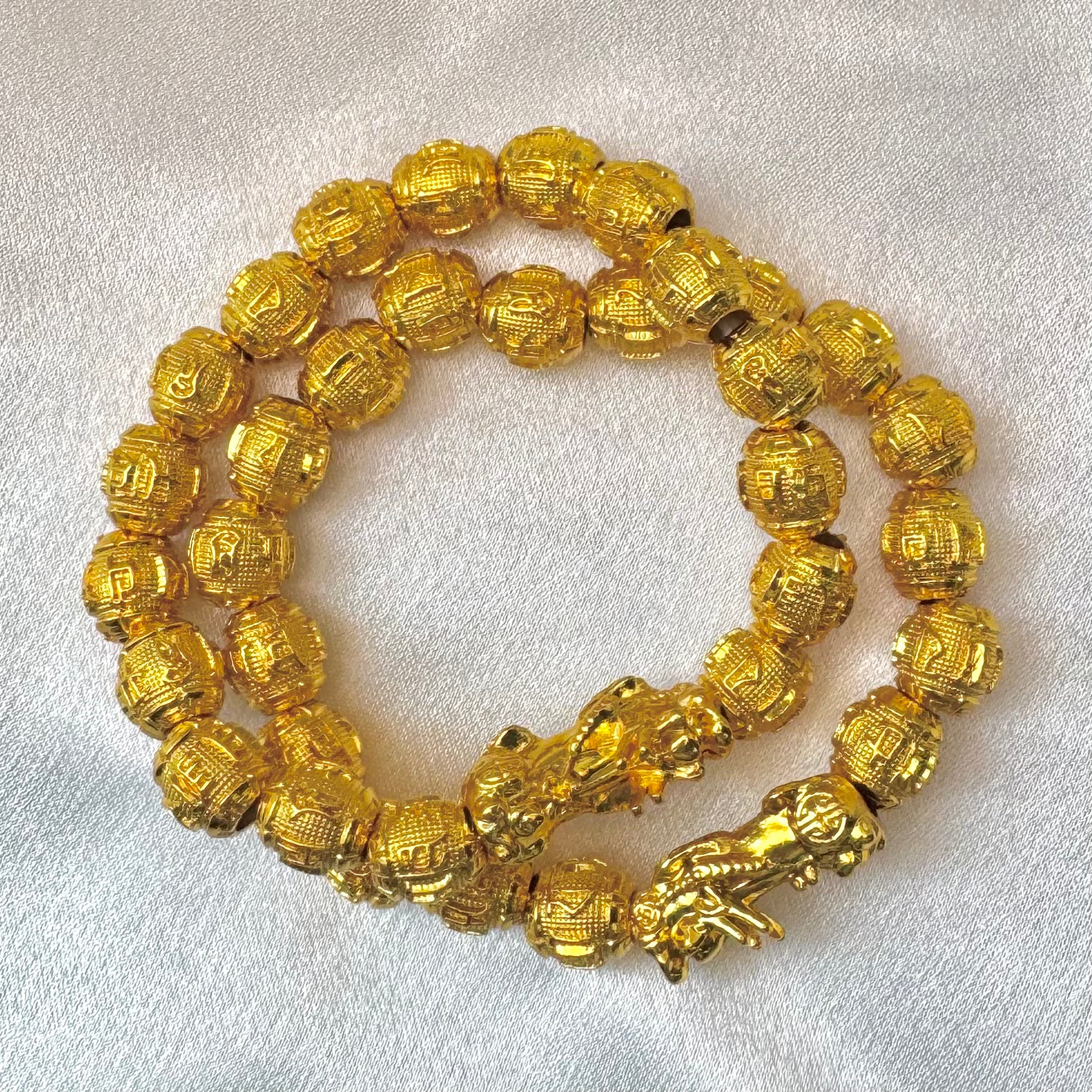 - Polished mantra beads and a detailed Pixiu charm in gold tone