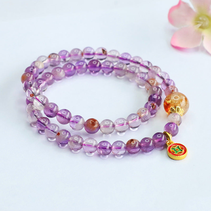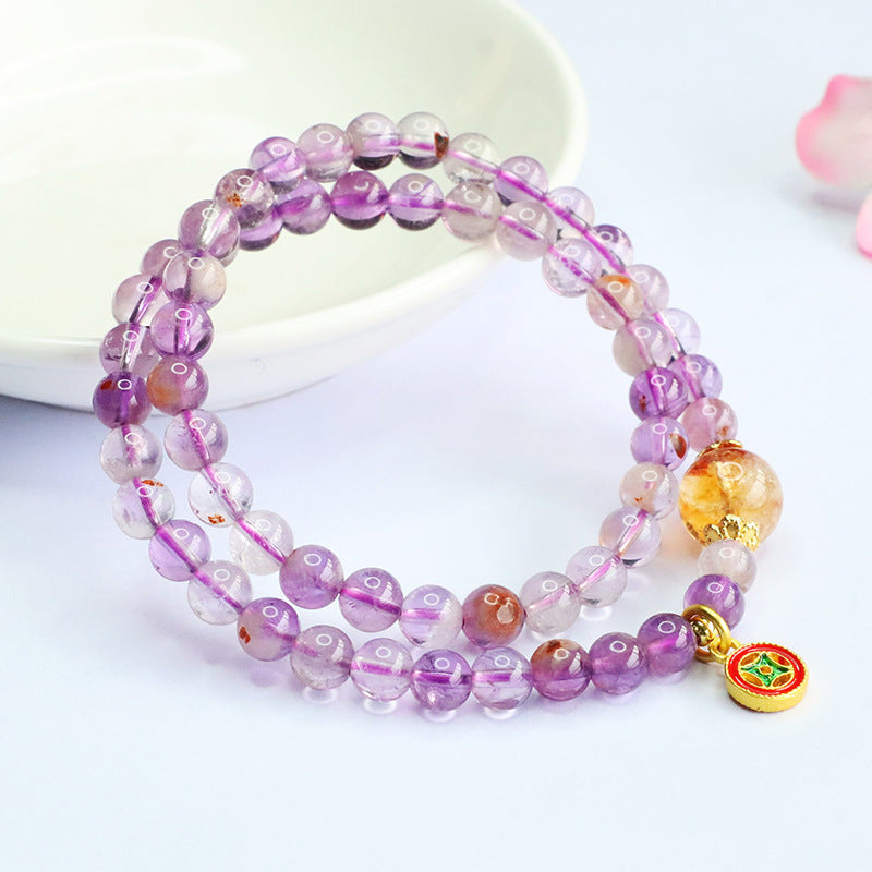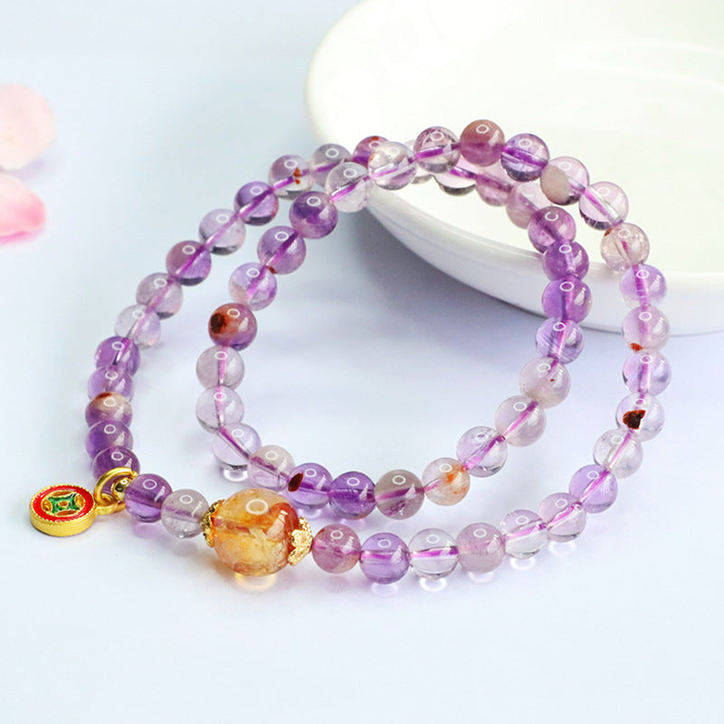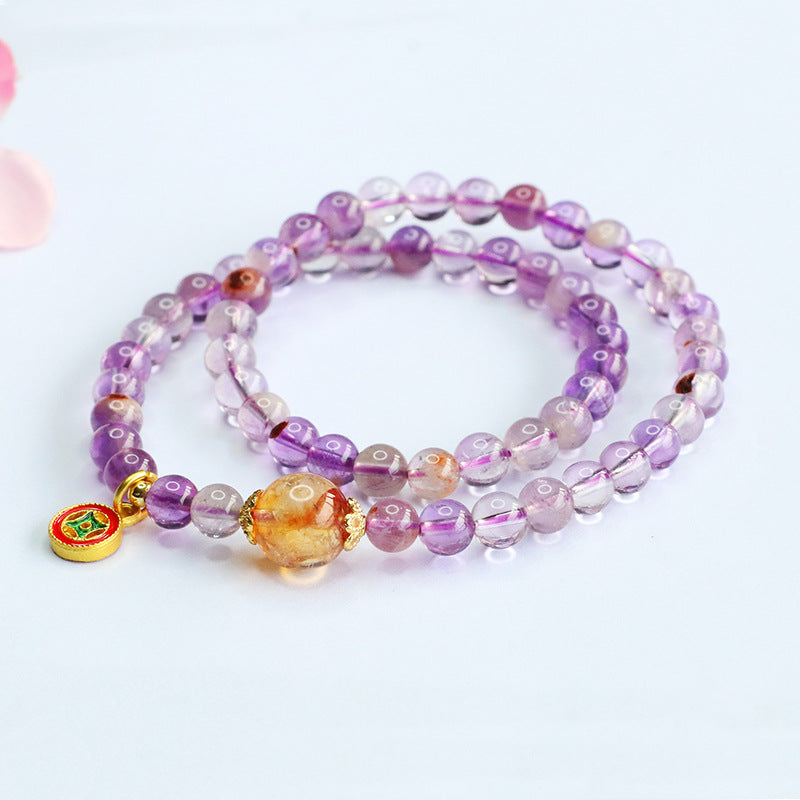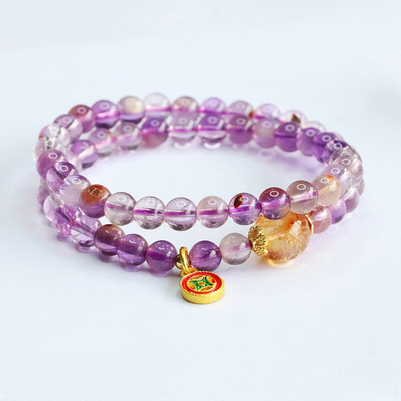 Double-Wrap Purple Phantom Quartz Citrine Charm Pendant Balance Bracelet