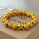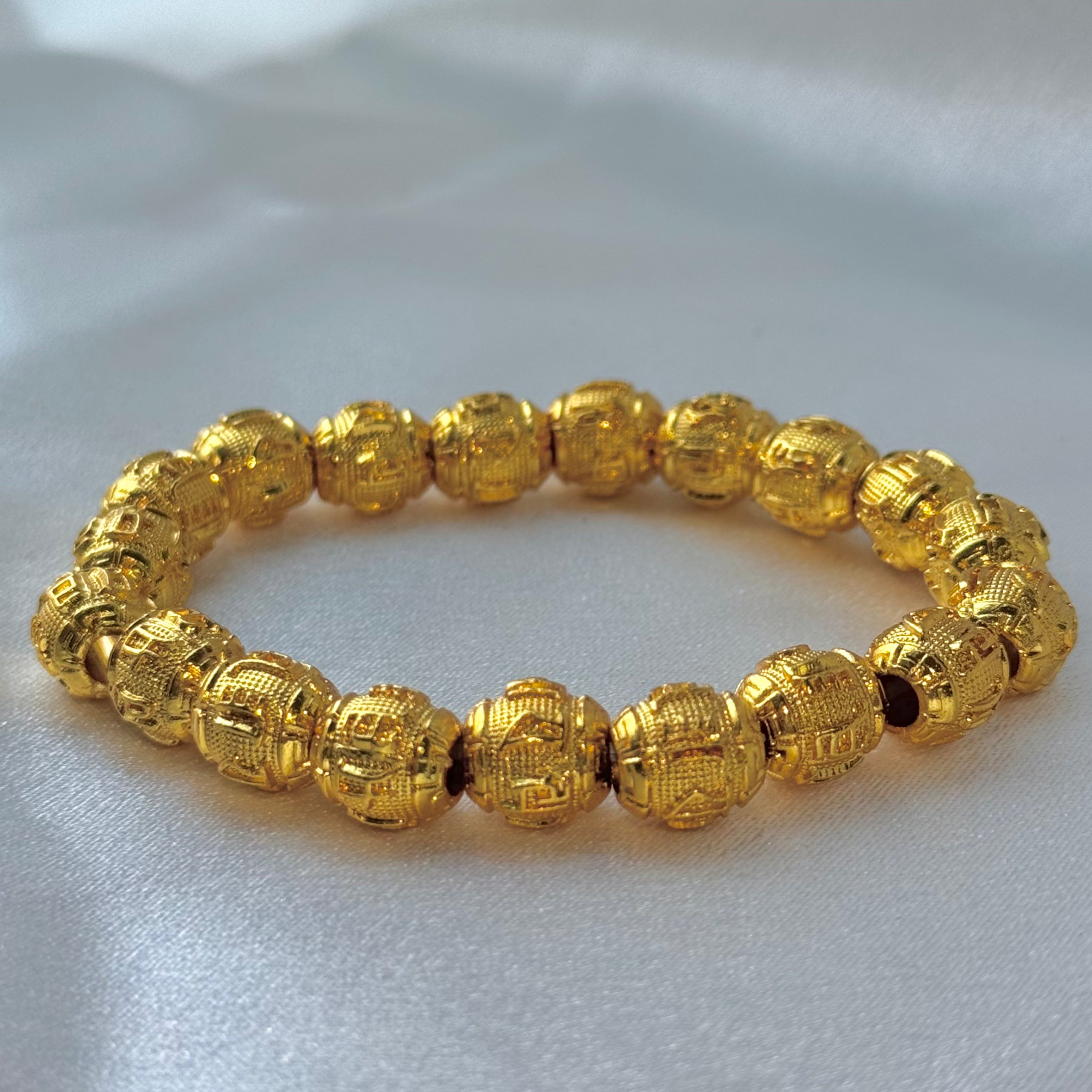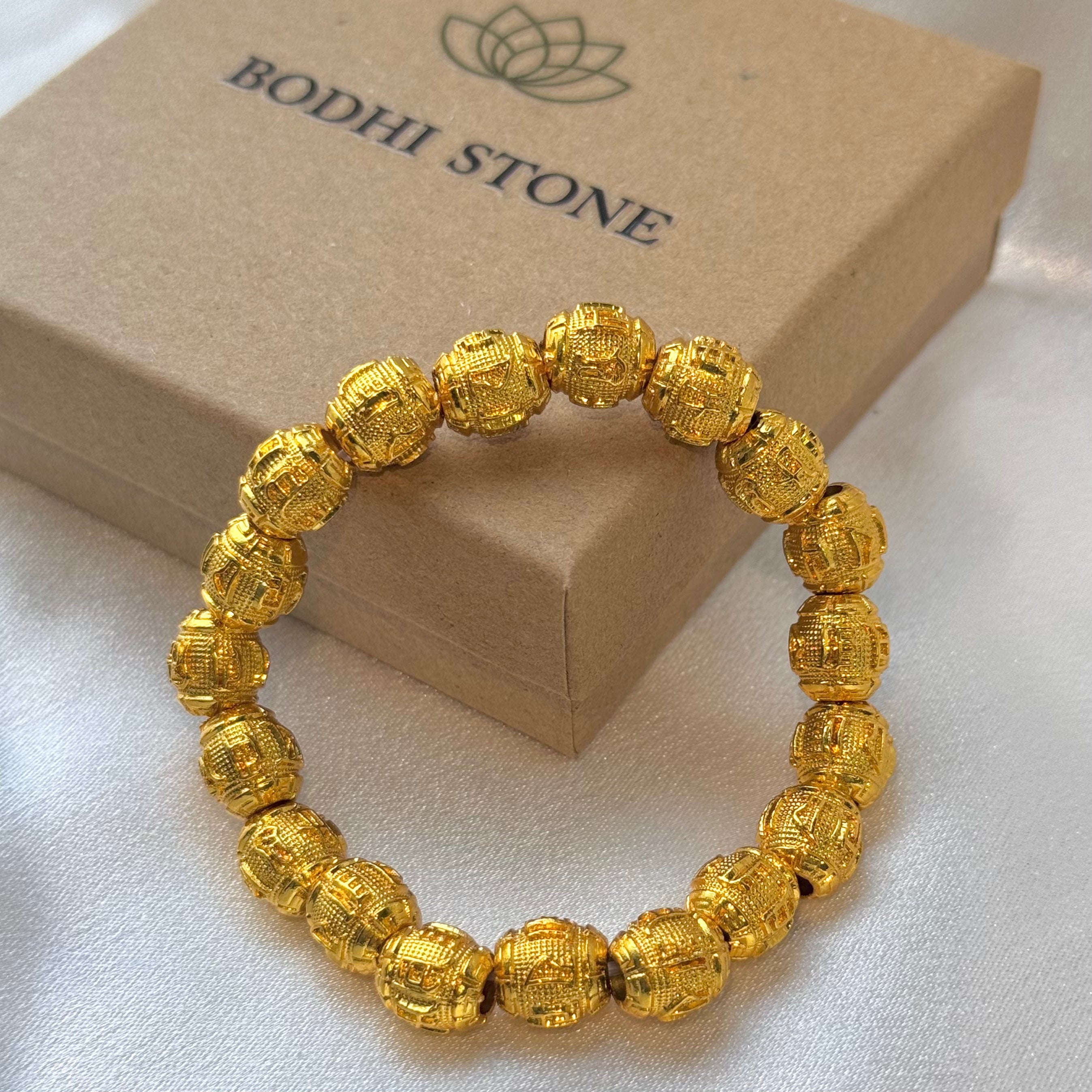 Step into your day with purpose and protection. This radiant bracelet features golden beads engraved with the sacred Six-Word Mantra—"Om Mani Padme Hum"—a revered Tibetan mantra known for inviting compassion, peace, and spiritual clarity.